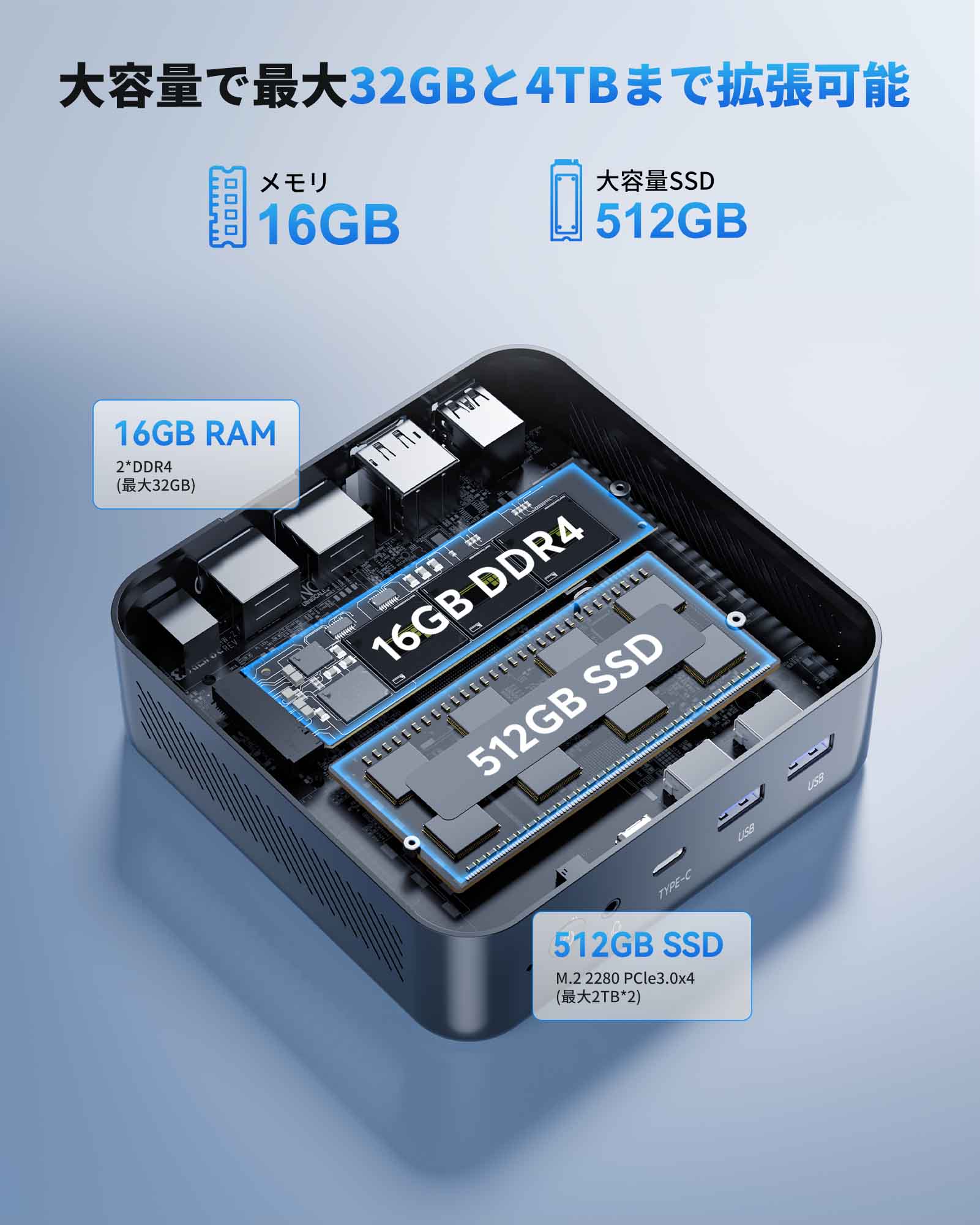 AMD Ryzen™5 3500U ミニpc 3.7GHz 16GB DDR4 512GB SSD 4TBまで増設可能 3画面同時出力 冷却ファン搭載 高速WiFi5 Wireless4.2 4K@60Hz USBx4 HDTV2.0 RJ45 小型pc VESA